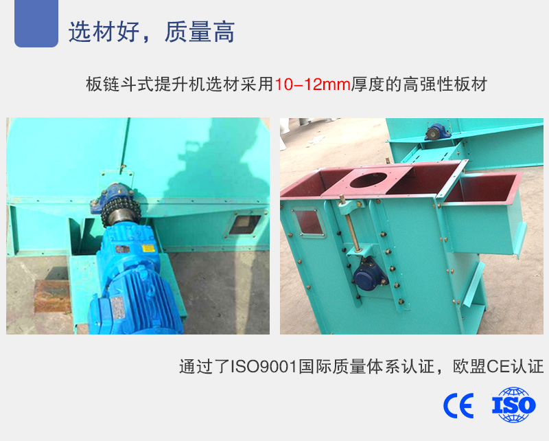 設備質量的好壞直接影響其工作效率,板鏈斗式提升機選材采用10-12mm厚度的高強性板材,產品不合格不出廠,我們生產的板鏈斗式提升機通過了ISO9001國際質量體系認證,歐盟CE認證,廠家承諾如果我們的產品在售出后30天出現問題可以免費退換。