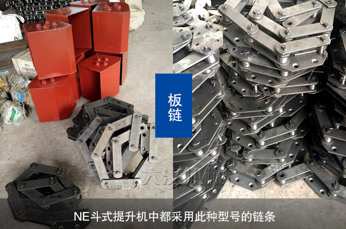 NE斗式提升機中都采用此種型號的鏈條,NE15斗式提升機是單鏈,把板鏈用螺栓和料斗直接緊固在一起就行(NE板鏈上有固定的螺絲孔),NE30以上的斗式提升機都是雙鏈條的,安裝時在料斗的兩側平行擺好板鏈鏈條,在斗式提升機料斗的左右兩側分別用螺栓把鏈條和料斗逐個螺緊即可。