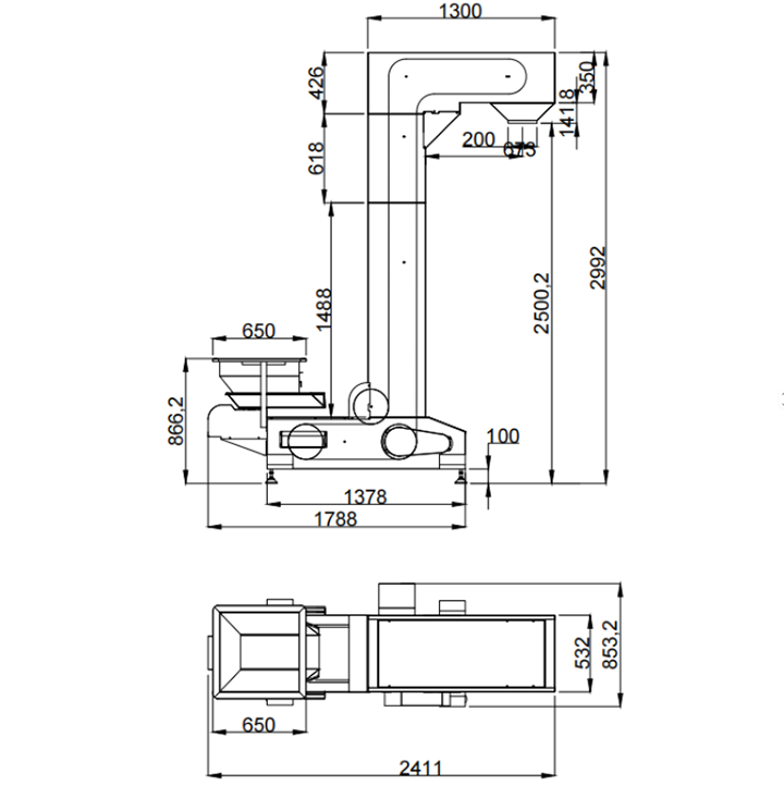 鏈條式Z型輸送機(jī)通常配備板鏈或附件鏈條,較高的承載能力和抗沖擊性能。輸送高度范圍可達(dá)2-15米以上,常用鏈條寬度為300–600mm,載重能力可達(dá)2t/h以上,適用于生產(chǎn)線負(fù)荷大、袋體較重或大容量液體袋的液體包裝場景。