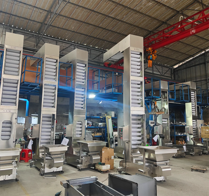 標(biāo)準(zhǔn)的液體填充袋Z型輸送機(jī)由驅(qū)動裝置、輸送帶單元、張力與改向裝置、承載機(jī)架、導(dǎo)向護(hù)攔系統(tǒng)等部分組成。驅(qū)動裝置包括電機(jī)、減速機(jī)、驅(qū)動滾筒,為系統(tǒng)提供動力;輸送帶單元由數(shù)段獨(dú)立的水平輸送機(jī)和傾斜輸送機(jī)模塊化拼接而成,構(gòu)成Z型主體框架;張力與改向裝置保證輸送帶正常運(yùn)轉(zhuǎn);承載機(jī)架采用不銹鋼或碳鋼噴塑結(jié)構(gòu),穩(wěn)固支撐整個輸送線;電氣控制系統(tǒng)包括控制柜、PLC、變頻器、傳感器等,實(shí)現(xiàn)自動控制與調(diào)速。